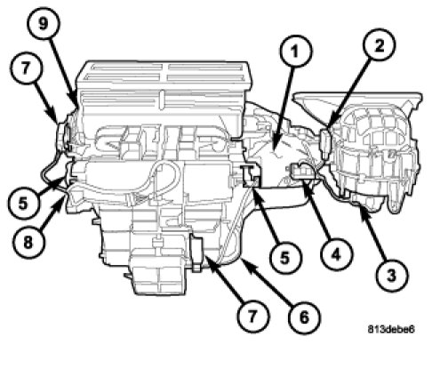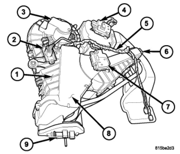 All vehicles are equipped with a common heater, ventilation and air conditioning (HVAC) housing (1). The heating-A/C system combines A/C, heating, and ventilating capabilities in a single HVAC housing mounted within the passenger compartment beneath the instrument panel. The HVAC housing includes: