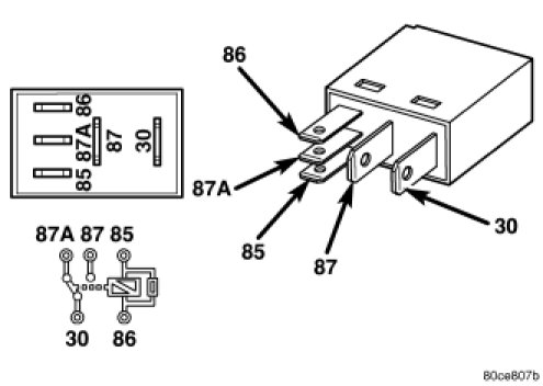 The rear fog lamp relay is a conventional International Standards Organization (ISO) micro relay. Relays conforming to the ISO specifications have common physical dimensions, current capacities, terminal patterns, and terminal functions. This relay is contained within a small, rectangular, molded plastic housing and is connected to all of the required inputs and outputs through five integral male spade-type terminals that extend from the relay base plate.