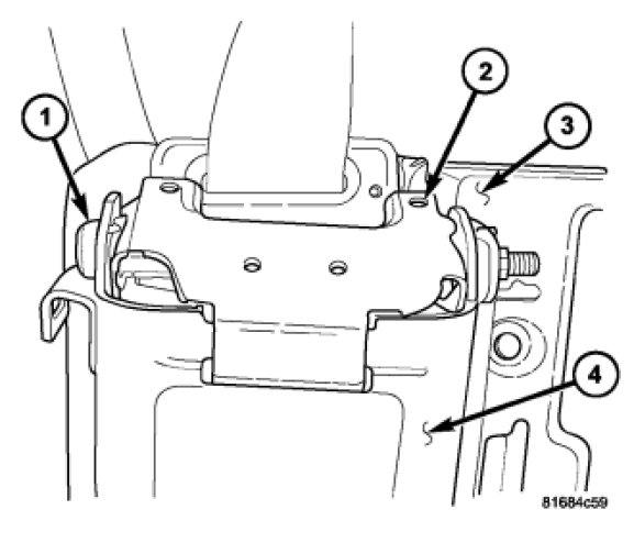 8. Position the seat belt lower anchor (4) to the outboard rear corner of the third row seat support bracket (1). Be certain that the belt webbing is not twisted between the top of the seat back and the lower anchor.