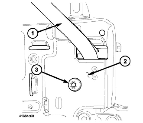 2. Install and tighten the screw (3) below the pull strap (1) from the back of the seat back frame (2) that secures the retractor. Tighten the screw to 43 Nm (32 ft. lbs.).