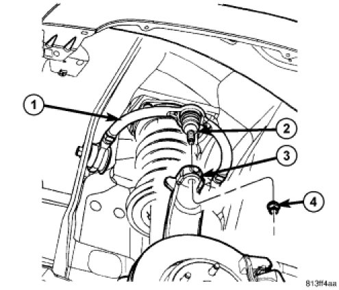 6. Install the steering knuckle (3) to the upper ball joint (2) and tighten the nut (4) to 95 Nm (70 ft. lbs.)Front Steering Knuckle - Installation.