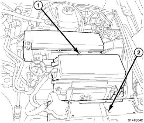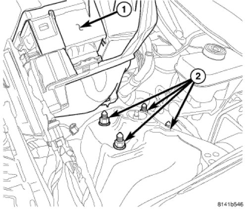 3. Move the PDC (1) off to the side to access the four upper shock mount nuts (2).