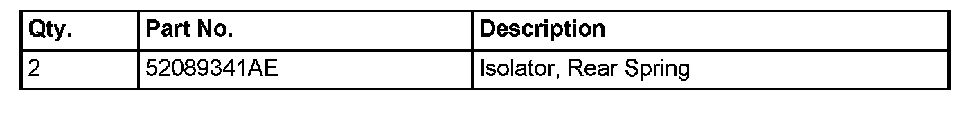 1. Replace the two (2) upper rear spring isolators. Refer to the detailed repair procedures in TechCONNECT - Service Info Tab /2 - Suspension / Rear / Spring / Removal and Installation.