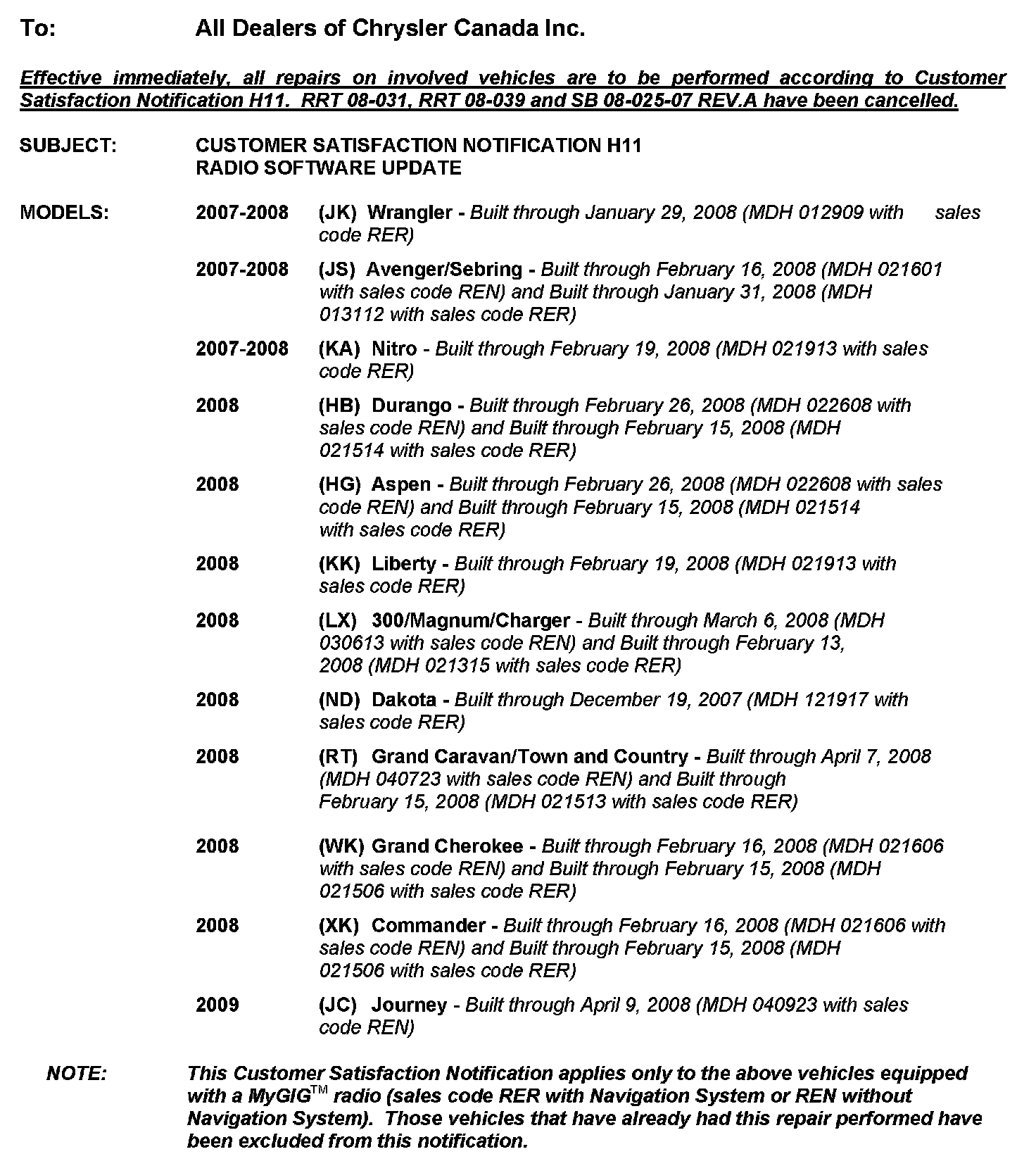 Effective immediately, all repairs on involved vehicles are to be performed according to Customer Satisfaction Notification H11. RRT 08-031, RRT 08-039 and SB 08-025-07 REV.A have been cancelled.