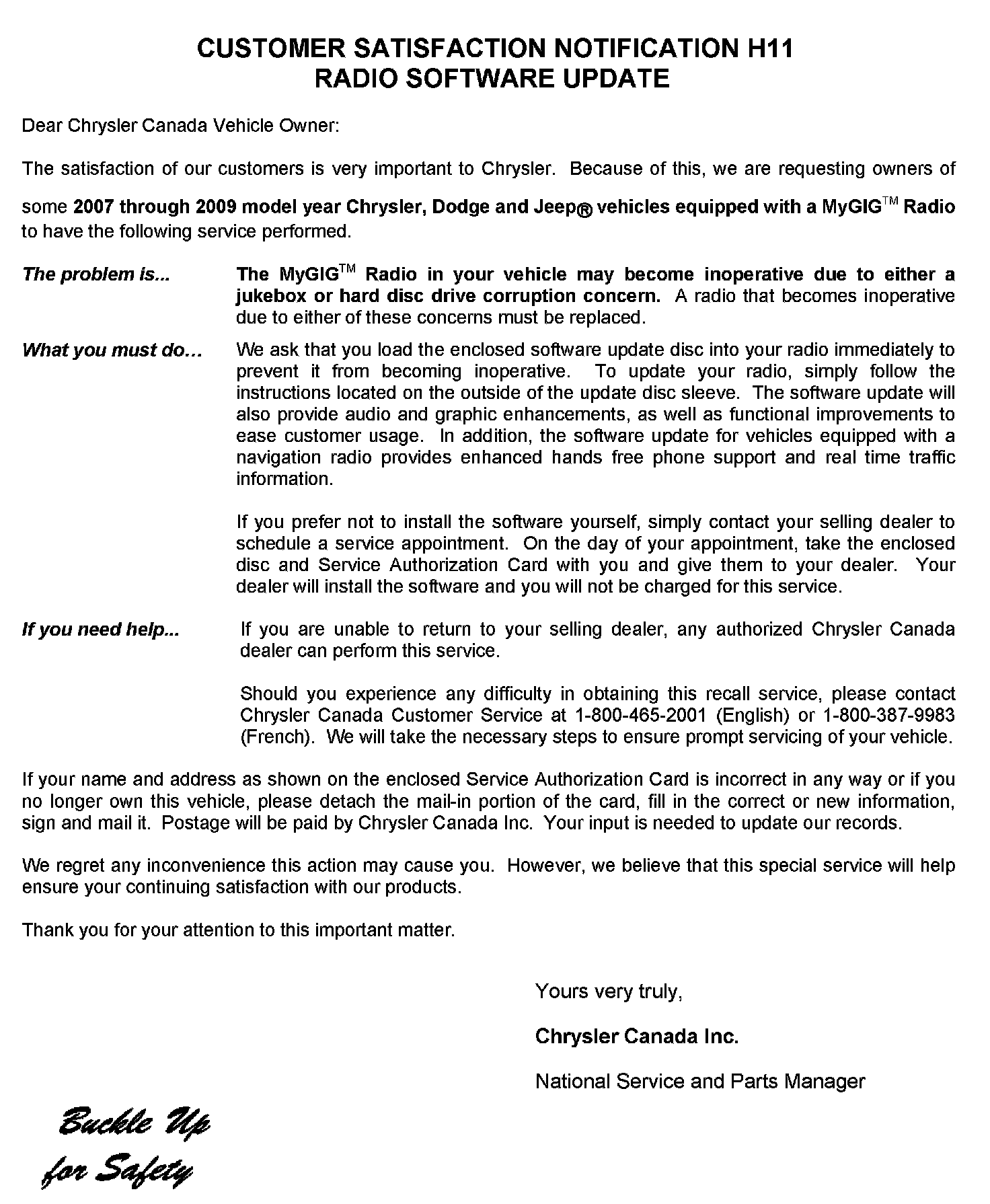 CUSTOMER SATISFACTION NOTIFICATION H11 RADIO SOFTWARE UPDATE
