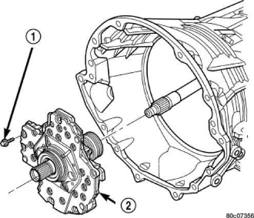 42. Install the bolts (1) to hold the oil pump into the transmission case. Tighten the oil pump bolts to 28 Nm (250 in.lbs.).