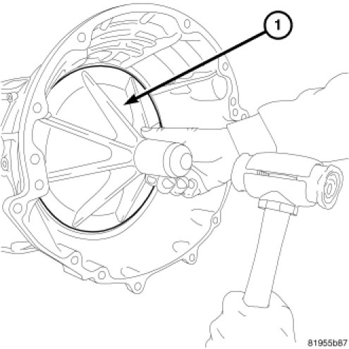 12. Install the 4C retainer/bulkhead tapered snap-ring (1) into the transmission case. Make sure that the open ends of the snap-ring are located in the case opening toward the valve body area.