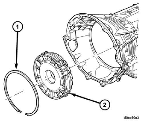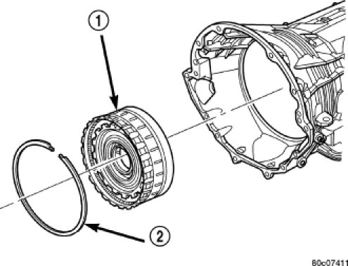 32. Install the 4C retainer/bulkhead (2) into the transmission case. Make sure that the oil feed holes are pointing toward the valve body area. Rotate the reaction annulus during the installation of the 4C retainer/bulkhead to ease installation.