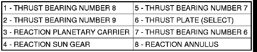 30. Install the number 6 thrust bearing (7) against the output shaft selective thrust plate (6) with the flat side against the thrust plate and the raised tabs on the inner race facing the front of the transmission.