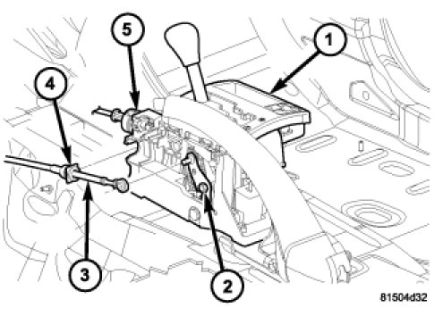 5. Connect the park lock cable (5) core to shift mechanism cam, and then secure cable housing to shift mechanism.