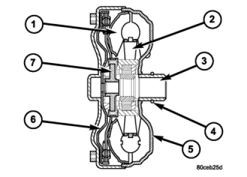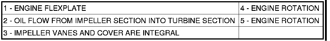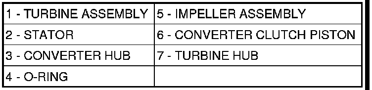 The torque converter is a hydraulic device that couples the engine crankshaft to the transmission. The torque converter consists of an outer shell with an internal turbine (1), a stator (2), an overrunning clutch, an impeller (5), and an electronically applied converter clutch (6). The converter clutch provides reduced engine speed and greater fuel economy when engaged. Clutch engagement also provides reduced transmission fluid temperatures. The torque converter hub (3) drives the transmission oil (fluid) pump and contains an o-ring seal (4) to better control oil flow.