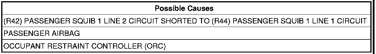 - Repair the (R42) Passenger Squib 1 Line 2 circuit for a short to the (R44) Passenger Squib 1 Line 1 circuit.