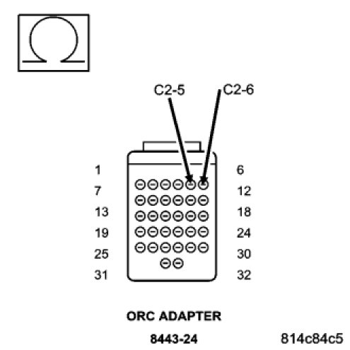 Measure the resistance between the (R42) Passenger Squib 1 Line 2 circuit and the (R44) Passenger Squib 1 Line 1 circuit at the ORC adaptor.