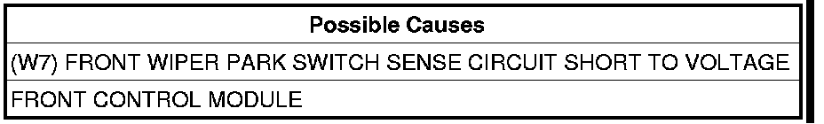 - Repair the (W7) Front Wiper Park Switch Sense circuit for a short to voltage.