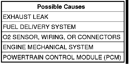 The conditions that cause this diagnostic to fail is when the upstream O2 sensor becomes biased from an exhaust leak, O2 sensor contamination, or some other extreme operating condition. The downstream O2 sensor is considered to be protected from extreme environments by the catalyst. The PCM monitors the downstream O2 sensor feedback control, called downstream fuel trim, to detect any shift in the upstream O2 sensor target voltage from nominal target voltage. The value of the downstream fuel trim is compared with the lean thresholds. Every time the value exceeds the calibrated threshold, a fail timer is incremented and mass flow through the exhaust is accumulated. If the fail timer and accumulated mass flow exceed the fail thresholds, the test fails and the diagnostic stops running for that trip. If the test fails on consecutive trips, a DTC is set.