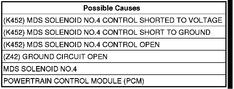 - Repair the short to ground in the (K452) MDS Solenoid No.4 Control circuit.