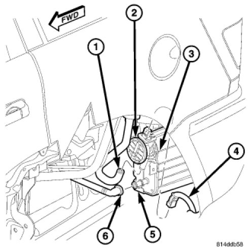 4. Carefully install vapor/vacuum lines (1) and (6) to NVLD pump and EVAP canister. The vapor/vacuum lines and hoses must be firmly connected. Check the vapor/vacuum lines at the NVLD pump, filter and EVAP canister purge solenoid for damage or leaks. If a leak is present, a Diagnostic Trouble Code (DTC) may be set.