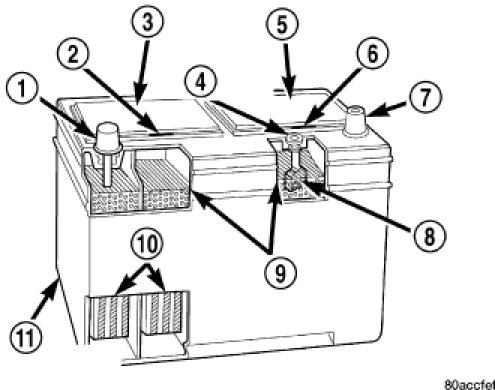 This vehicle is equipped with a single, 12-volt, maintenance-free battery located in the engine compartment. The battery is comprised of the following components: