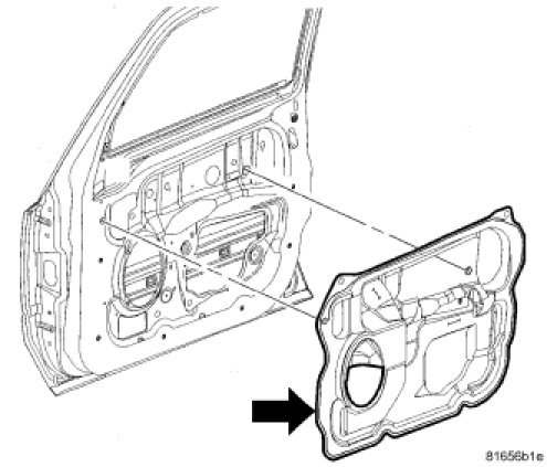 5. Install the watershield (1) onto the inside of the front door (2). Installation