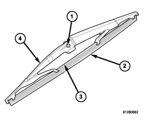 The rear wiper blade is secured by two integral latching pivot pins (1) to a receptacle in the small end at the tip of the rear wiper arm, and rests below the liftgate glass when the wiper is not in operation. The rear wiper blade consists of the following components: