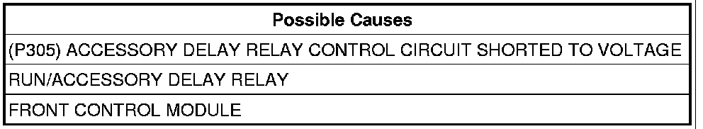 3. (P305) ACCESSORY DELAY RELAY CONTROL CIRCUIT SHORTED TO VOLTAGE