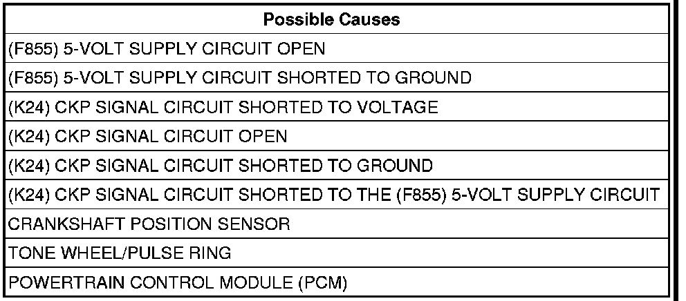 - Repair the short between the (F855) 5-volt Supply circuit and the (K24) CKP Signal circuit.
