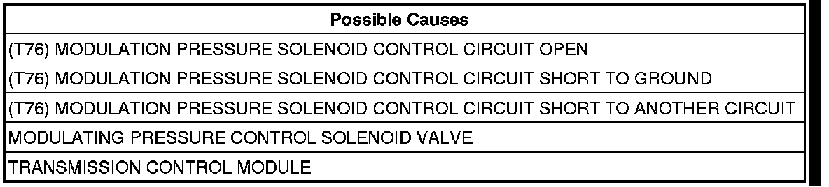 - Repair the (T76) Modulation Pressure Solenoid Control circuit for an open.