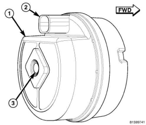 The alarm siren module consists of microprocessor-based electronic control circuitry, the siren, and a nickel metal hydride backup battery. All of the alarm module components are protected and sealed within a molded plastic housing. An integral connector receptacle (2) extends rearward from the top of the housing and connects the unit to the vehicle electrical system through a dedicated take out and connector of the headlamp and dash wire harness. The housing also has a threaded insert within the mounting hole (3) on the back through which a screw secures it to a stamped metal mounting bracket. The siren and bracket unit are located in a hollow behind the right end of the front frame crossmember outboard of the right front frame rail. A single screw secures the mounting bracket to the right end of the front crossmember.