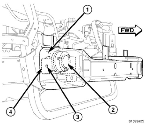 2. Install and tighten the screw (3) that secures the siren mounting bracket (4) to the right end of the front crossmember. Tighten the screw to 14 Nm (10 ft. lbs.).
