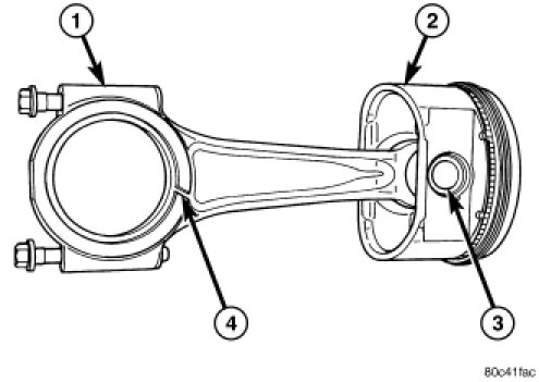 The pistons (2) are made of a high strength aluminum alloy. The connecting rods are made of forged powdered metal, with a "fractured cap" design (1). A full floating piston pin (3) is used to attach the piston to the connecting rod.