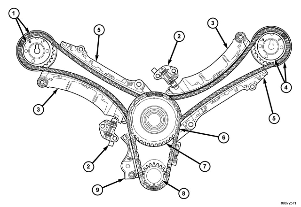 The timing drive system has been designed to provide quiet performance and reliability to support a non-free wheeling engine. Specifically the intake valves are non-free wheeling and can be easily damaged with forceful engine rotation if camshaft-to-crankshaft timing is incorrect. The timing drive system consists of a primary chain, two secondary timing chain drives and a counterbalance shaft drive.