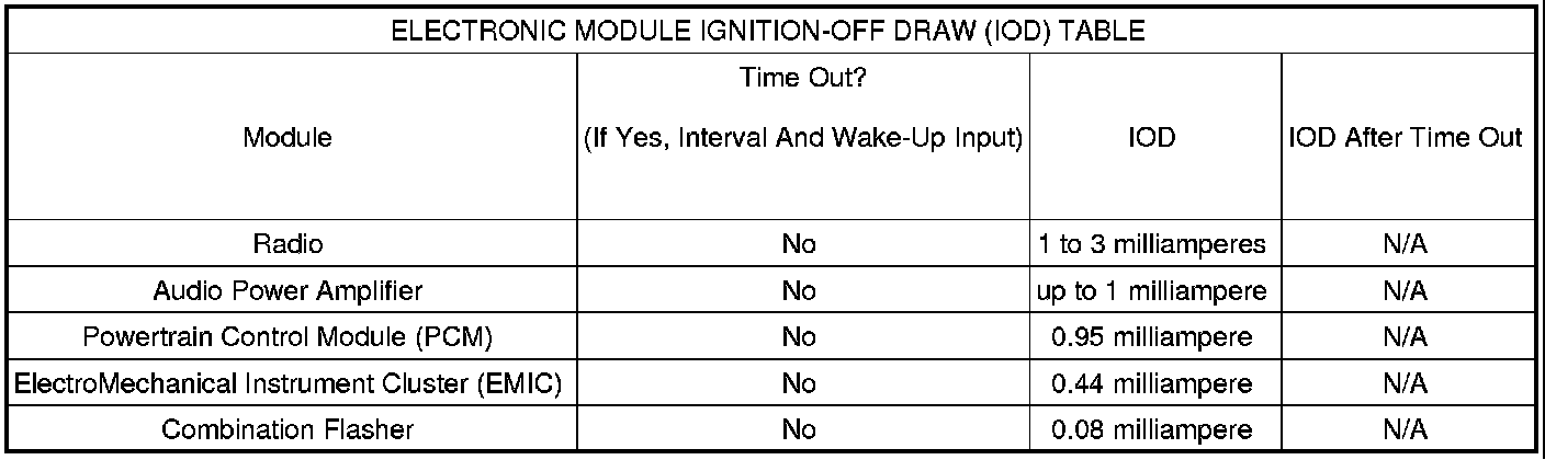 The term Ignition-Off Draw (IOD) identifies a normal condition where power is being drained from the battery with the ignition switch in the Off position. A normal vehicle electrical system will draw from five to thirty-five milliamperes (0.005 to 0.035 ampere) with the ignition switch in the Off position, and all non-ignition controlled circuits in proper working order. Up to thirty-five milliamperes are needed to enable the memory functions for the Powertrain Control Module (PCM), digital clock, electronically tuned radio, and other modules which may vary with the vehicle equipment.