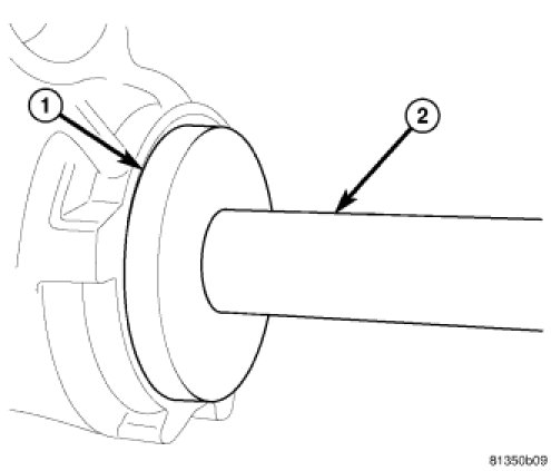 13. Install pinion flange (1) on pinion with Installer 9616 (2). Tap flange on pinion, then thread installer center bolt on pinion shaft and draw flange onto the pinion.