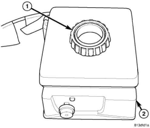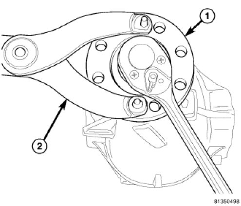 14. Hold pinion flange (1) with Flange Wrench C-3281 (2) and tighten pinion nut until torque to rotate is 1.5 - 1.9 Nm (13 - 17 in. lbs.).