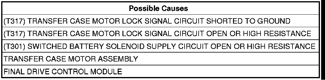 - Repair the (T317) Transfer Case Motor Lock Signal circuit for a short to ground.