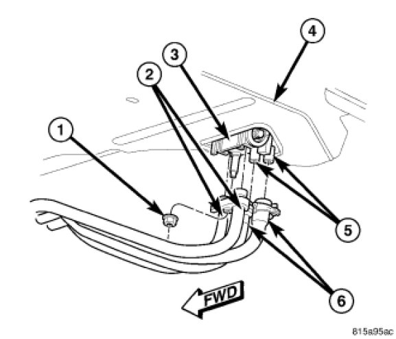 6. Connect the rear heater hoses (6) to the rear heater core tubes (5) which extend through the rear floor panel (4) behind the right rear wheel housing and install the heater hose clamps securely.