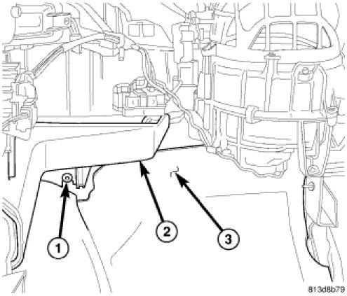 6. Tighten the nut (1) that secures the HVAC housing assembly (2) to the passenger compartment side of the dash panel (3) to 7 Nm (62 in. lbs.).