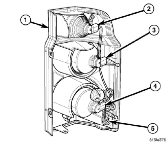 NOTE: The rear lamp unit (1) contains four bulbs. For domestic market vehicles they are: backup (2), park/stop (3), park/turn signal (4) and rear side marker (5). The service procedures for each bulb are the same, only the bulb sizes and types may differ.