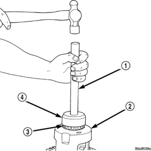 Install differential case (2) bearings (3) with bearing Installer 9535 (4) and Handle C-4171(1).