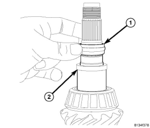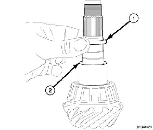 8. Install spacer (1) on pinion shaft (2) with the beveled side facing the gear.