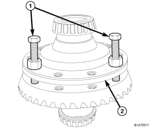 1. Install left hand thread ring gear Installer Bolts 9533 (1) through differential (2) and into ring gear. Tighten nuts on installer bolts evenly and draw ring gear onto differential case.