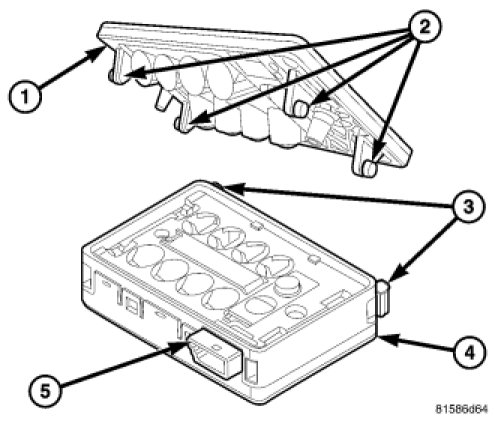 The molded black plastic sensor housing has an integral connector receptacle (5) at the top containing four terminal pins. These terminal pins connect the rain sensor to the vehicle electrical system through a dedicated take out and connector of the overhead wire harness that extends from above the headliner. Openings on the windshield side of the housing are fitted with eight convex clear plastic lenses. A sliding cam lock retainer (3) on each side of the sensor housing latches the sensor to four pins (2) on the mounting bracket (1), which is permanently bonded to the inside of the windshield glass with an adhesive pad.