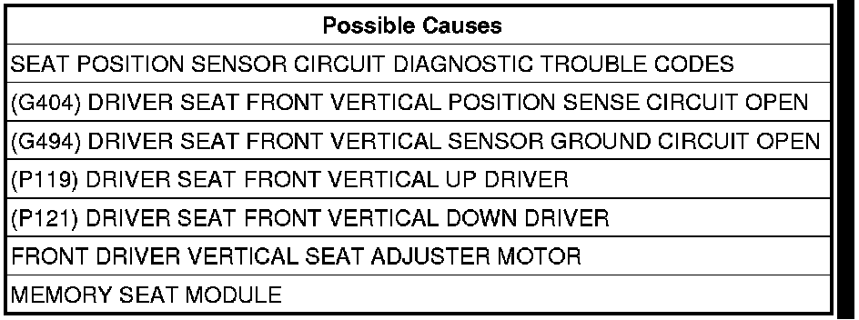 - Repair the (G404) Driver Seat Front Vertical Position Sense circuit for an open.
