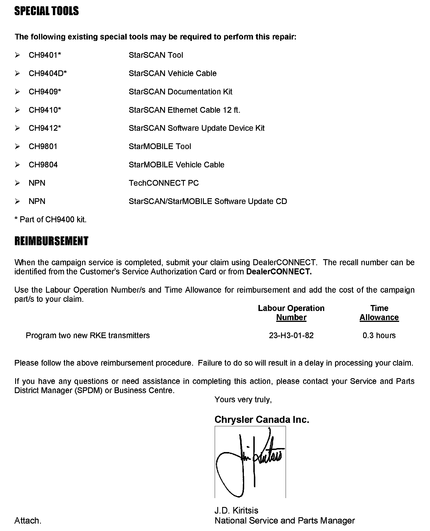 All involved vehicle owners known to Chrysler are being notified of the service requirement by mail. They are requested to schedule appointments for this service with their dealers. A generic copy of the owner letter is included.