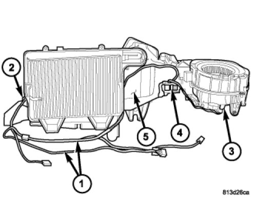 14. Install the HVAC wiring harness (1) onto the HVAC housing (5) and engage the two wire harness retainers to the housing.