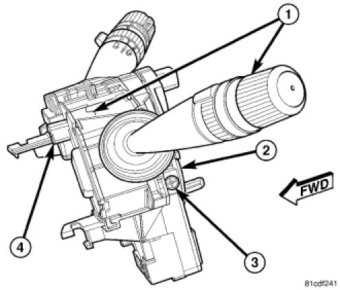 1. Position the left multi-function switch (1) close enough to the mounting bracket integral to the left side of the clockspring (2) to reconnect the jumper wire harness connector to the connector receptacle on the inboard side of the switch housing.