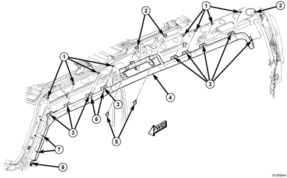 6. Install and tighten the eight screws (3) that secure the side curtain airbag channel to the box nuts (1) in the roof side rail. Tighten the screws to 6 Nm (50 in. lbs.).