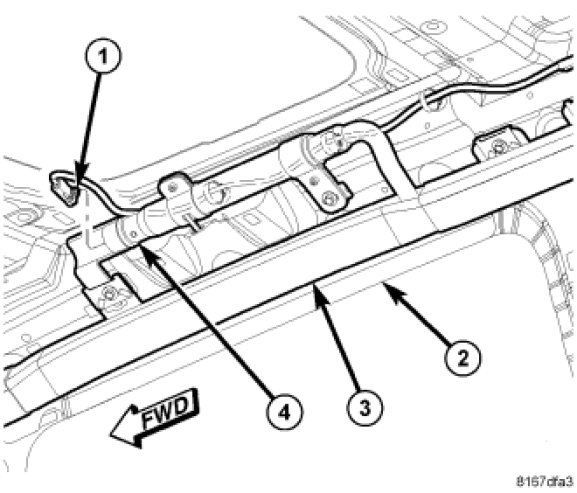 10. Reconnect the body wire harness connector (1) for the side curtain airbag (3) to the connector receptacle at the back of the inflator (4) on the roof side rail (2) between the B and C-pillars.