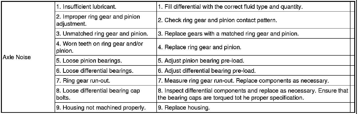 When road testing, first warm-up the axle fluid by driving the vehicle at least 5 miles and then accelerate the vehicle to the speed range where the noise is the greatest. Shift out-of-gear and coast through the peak-noise range. If the noise stops or changes greatly:
