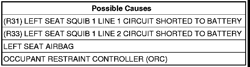 The Occupant Restraint Controller (ORC) monitors the voltage on the Left Seat Airbag circuits. If voltage is detected on the Left Seat Airbag circuits the ORC will set this DTC.
